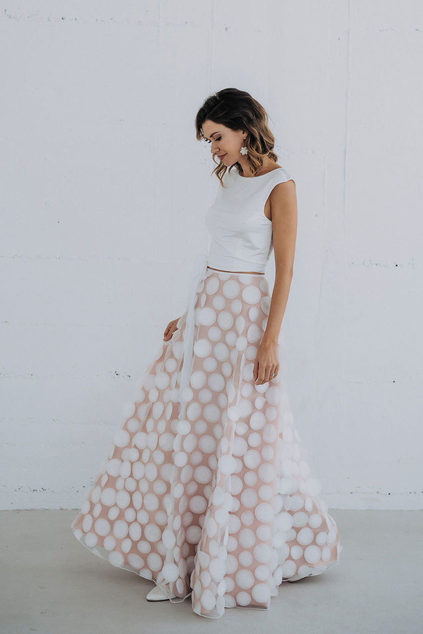 Für meine standesamtliche Hochzeit mit anschließender Feier im Park habe ich ein halblanges Kleid gefunden, das ein florales Oberteil mit Spitze und tiefen Rückenausschnitt hat.
