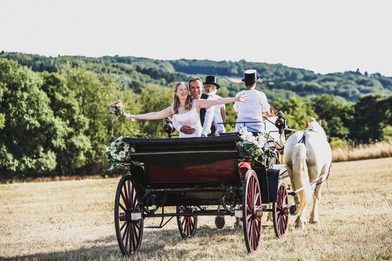 Was zunächst rustikal klingen mag, sah bei Christel und Yasir durchaus elegant aus: Die Gartenhochzeit auf dem Land wurde durch fröhlichen Blumenschmuck und grün-weiße Dekorations- und Papeterieelemente bestimmt. Durch kleine Details in der Gestaltung des Gartens und die schicke Kleidung des Brautpaars und der Hochzeitsgesellschaft kam aber auch die angemessene Portion Eleganz nicht zu kurz. Auf der Kutschfahrt durch das Dorf hatte das Brautpaar nicht nur sichtlich Spaß, sondern konnte im langen, weißen Kleid und dreiteiligen Anzug mit Fliege bestimmt auch ordentlich Eindruck machen.