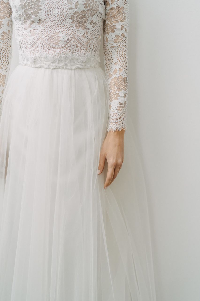 Eiin Traum aus Tüll: Das Brautoberteil Lucy besteht aus feiner Spitze mit Ornamentmuster, die dank langer Ärmel prima zur Geltung kommt. Ein tiefer, runder Rückenausschnitt und die darüber gelegte Spitze runden diesen Look ab. Kombinieren lässt sich dieses wunderschöne Oberteil mit dem dreilagigen Tüllrock Rom. Ganze 18 Meter Tüll lassen Herzen höher schlagen. Der Bund des Tellerrocks betont die Taille und den ausladenden Rock umso mehr. Lucy lässt sich ebenso gut mit dem weißen Chiffonrock Valencia oder einer Hose tragen.