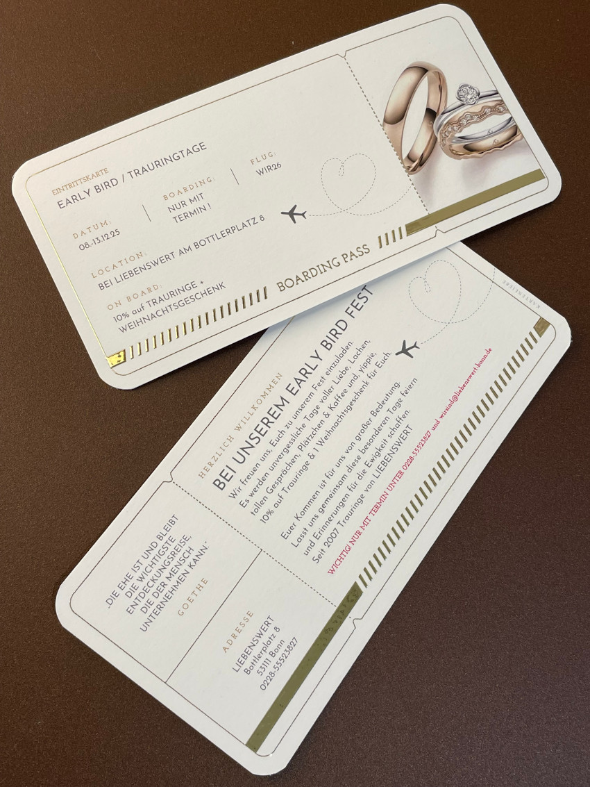 Early Bird Fest bei LIEBENSWERT in Bonn – mit 10 % Rabatt auf Trauringe & weihnachtlicher Überraschung