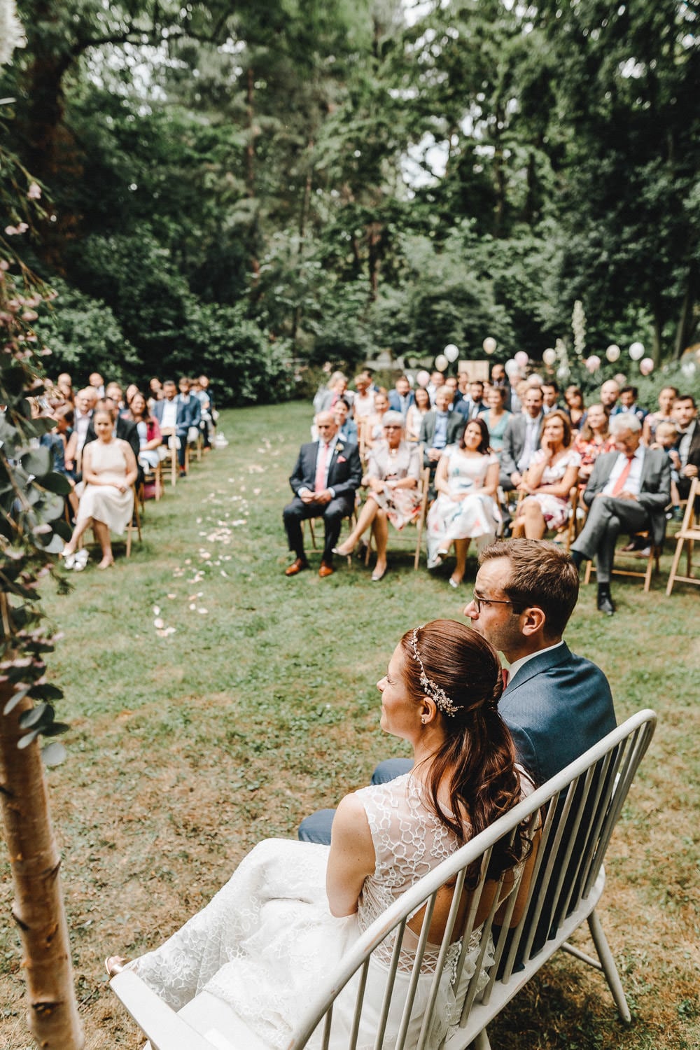 Bevor die beiden unter freiem Himmel ihr Ja-Wort und die Ringe tauschten, ging es erst einmal zum "First Look"-Shooting in den Friedenspark. Danach wurden sie von ihren Gästen in Empfang genommen. Ganz im Grünen - gefühlt weit weg vom Trubel der Großstadt - fand dann eine wirklich emotionale und herzliche Trauung statt.