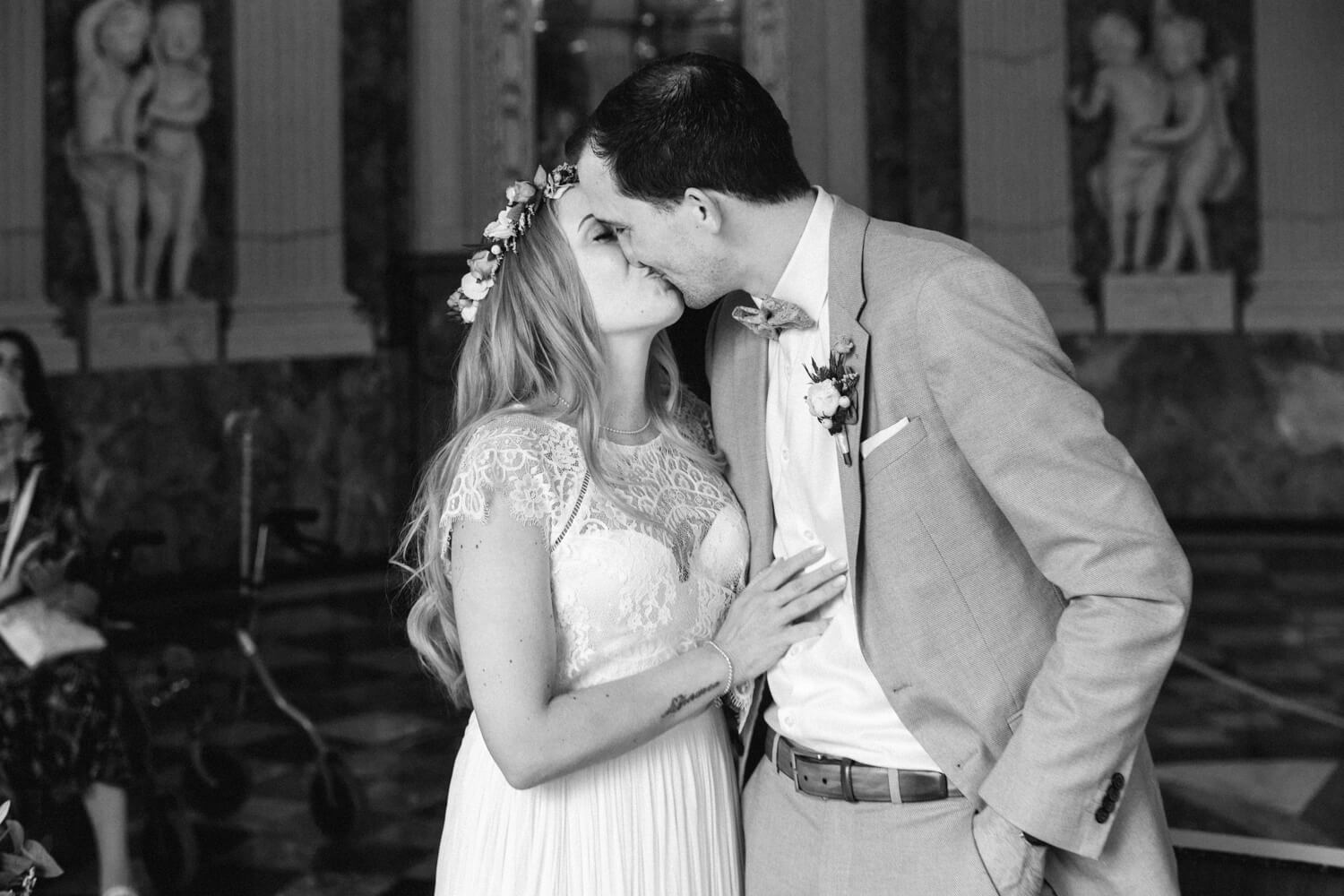 Außerdem solltet ihr euch schon vorher Gedanken darüber machen, welche Fotos ihr im Schloss machen wollt. Denn der Zeitplan ist straff: Im Anschluss an die standesamtliche Trauung habt ihr nur wenige Minuten Zeit für Fotoaufnahmen im Kuppelsaal und Vestibül.