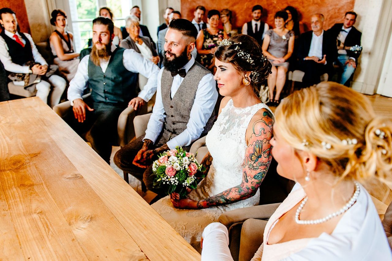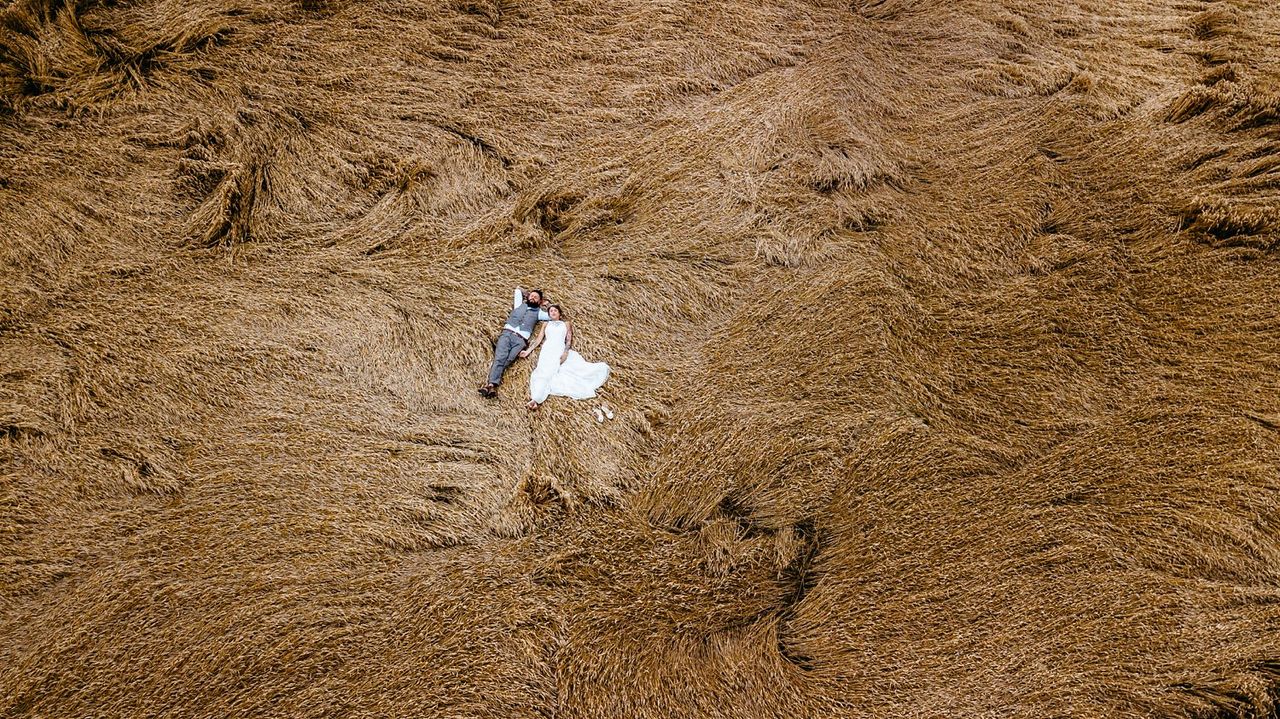 Nach dem Getting Ready begann der Hochzeitstag mit der standesamtlichen Trauung im Elisenturm in Wuppertal. Beim anschließenden Paarshooting waren sich Amelie und Mitch für nichts zu schade. Zur Freude der Hochzeitsfotografen Elli und Roland von DUO-Lux Photography. "Ob auf Heuballen klettern, rennen, im Feld liegen - die beiden haben wirklich alles mitgemacht und wir konnten auch mit unserer Drohne wunderschöne Aufnahmen machen."