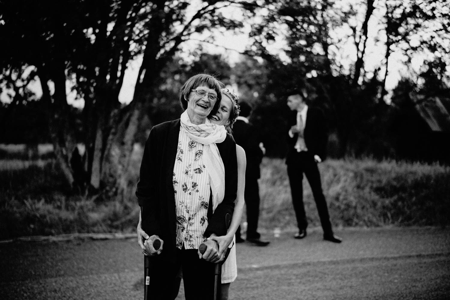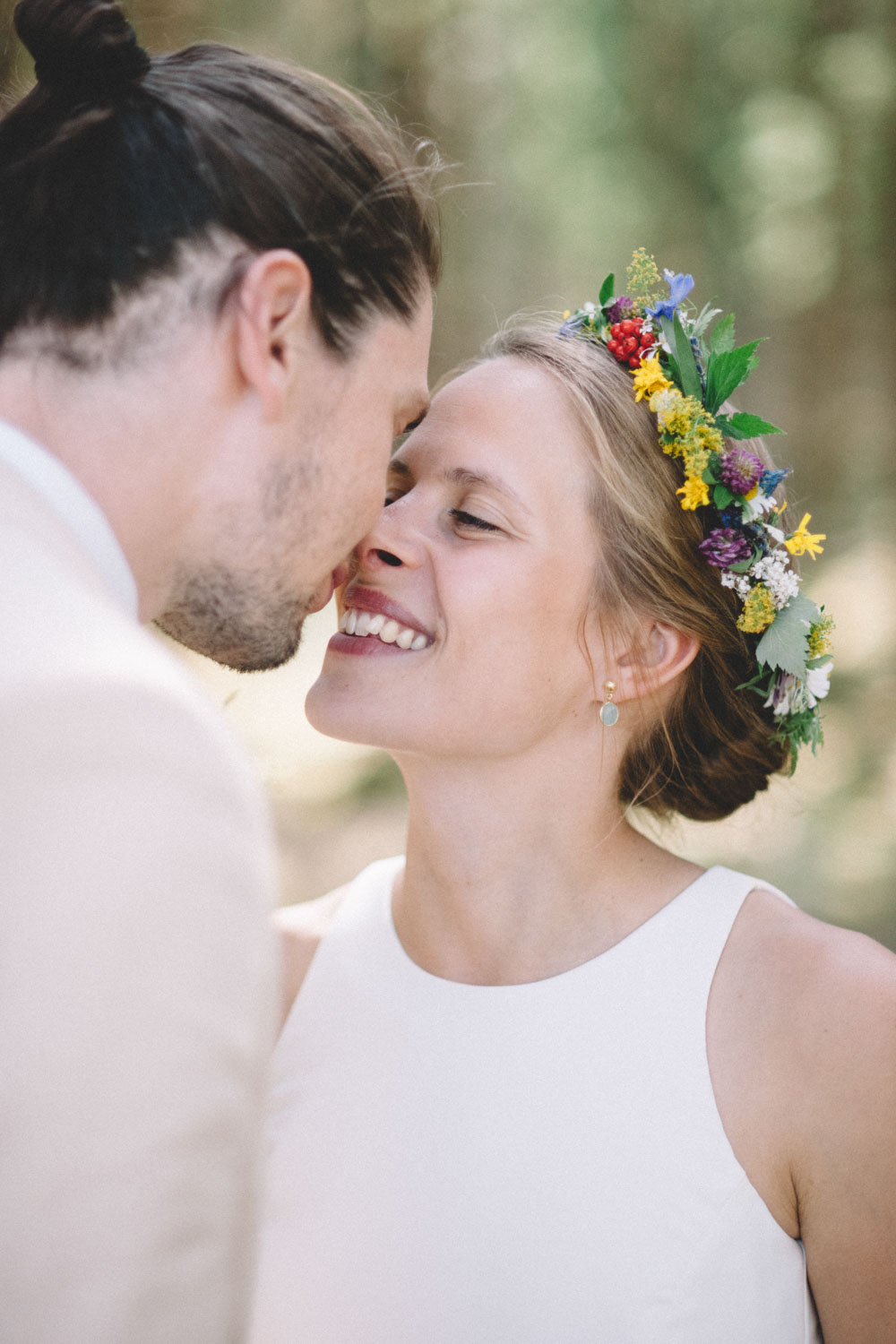 Es wurde gemeinsam vorbereitet, im See gebadet, Musik gemacht, Grün für die Girlanden und andere Dekoelemente gesammelt und vor allem: gelacht. Auch Fotograf Simon Thon wurde in alle Schritte miteingebunden, sodass er sich schon nach kurzer Zeit als Teil dieser großen bunten und fröhlichen Familie fühlte. Das gemeinsame Vorbereiten, Erleben und Zelebrieren ihrer Hochzeit war für Lisa und Jens das größte Hochzeitsgeschenk.