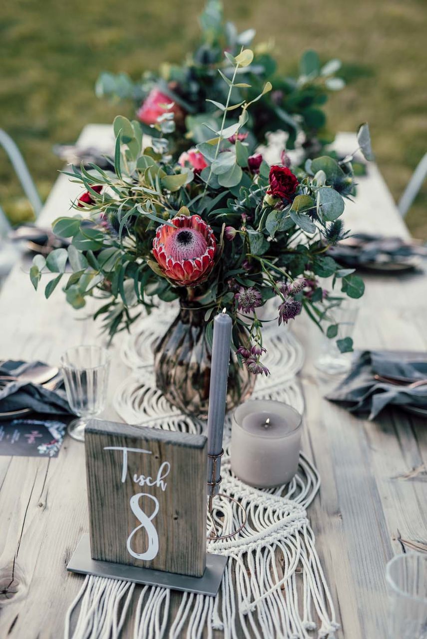 Eine romantisch-wilde Outdoor-Hochzeit mit freier Trauung unter dem Traubogen und einem Hochzeitsdinner an Retro-Holzbohlentischen, dekoriert mit großen Blüten in verschiedenen Rottönen und trendigem Eukalyptus, dazu Boho-Tischläufer und messingfarbenes Besteck und natürlich ein verliebtes Brautpaar – schon hat man eine tolle und charaktervolle Hochzeit.