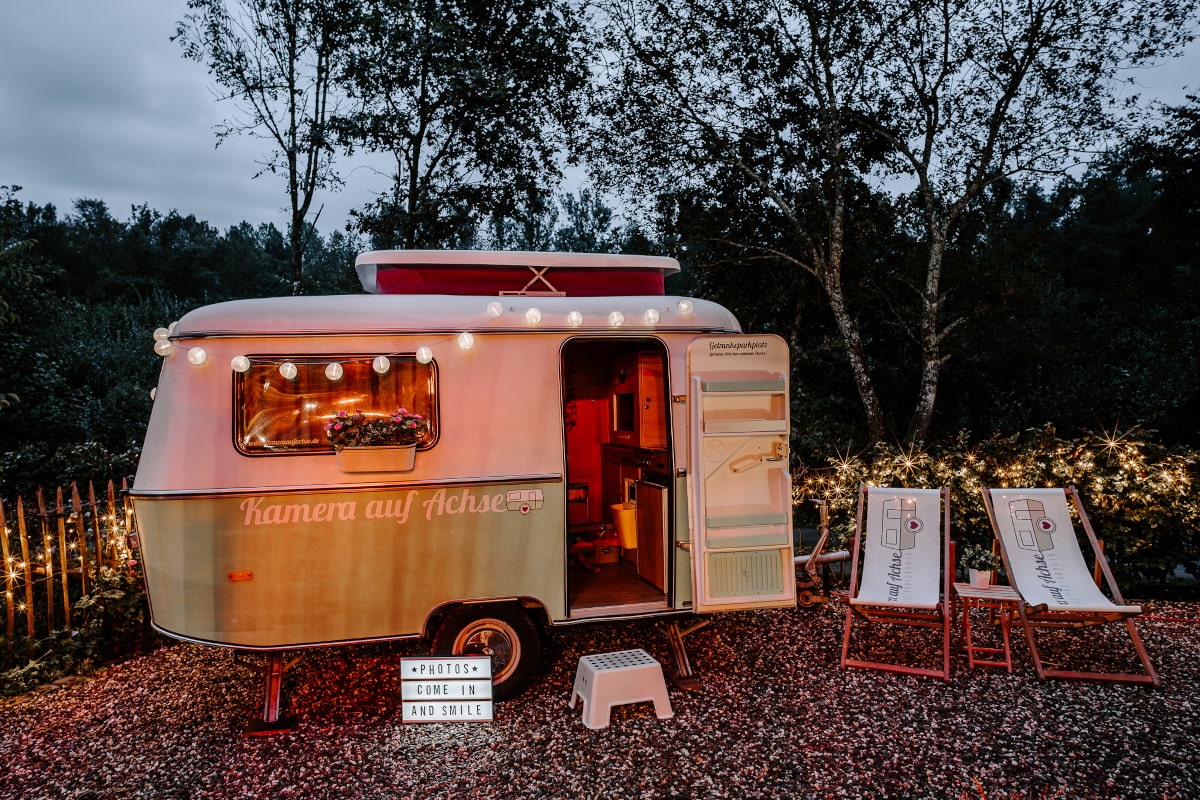 Fotoboxen kommen in vielen verschiedenen Formen daher und sind ein echter Klassiker. Neben der professionellen Hochzeitsfotografie bietet so eine Fotobox euren Gästen die Chance, eigene, ungestellte Erinnerungsfotos zu schaffen, die sie als Andenken direkt mit nach Hause nehmen dürfen. Witzige Accessoires sorgen für einen zusätzlichen Fun-Factor.